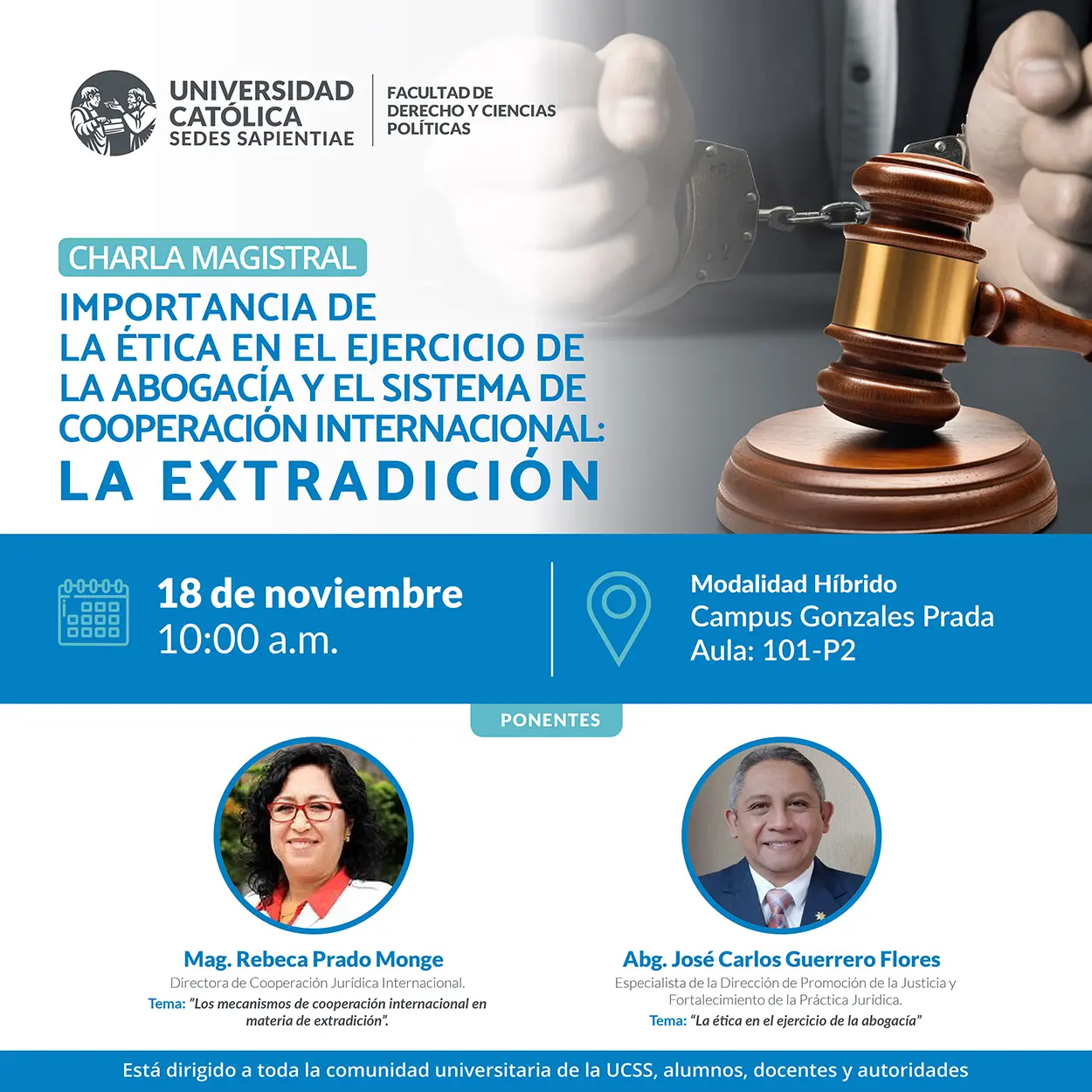 Charla Magistral "IMPORTANCIA DE LA ÉTICA EN EL EJERCICIO DE LA ABOGACÍA Y EL SISTEMA DE COOPERACIÓN INTERNACIONAL: LA EXTRADICIÓN" Ir al formulario de inscripción