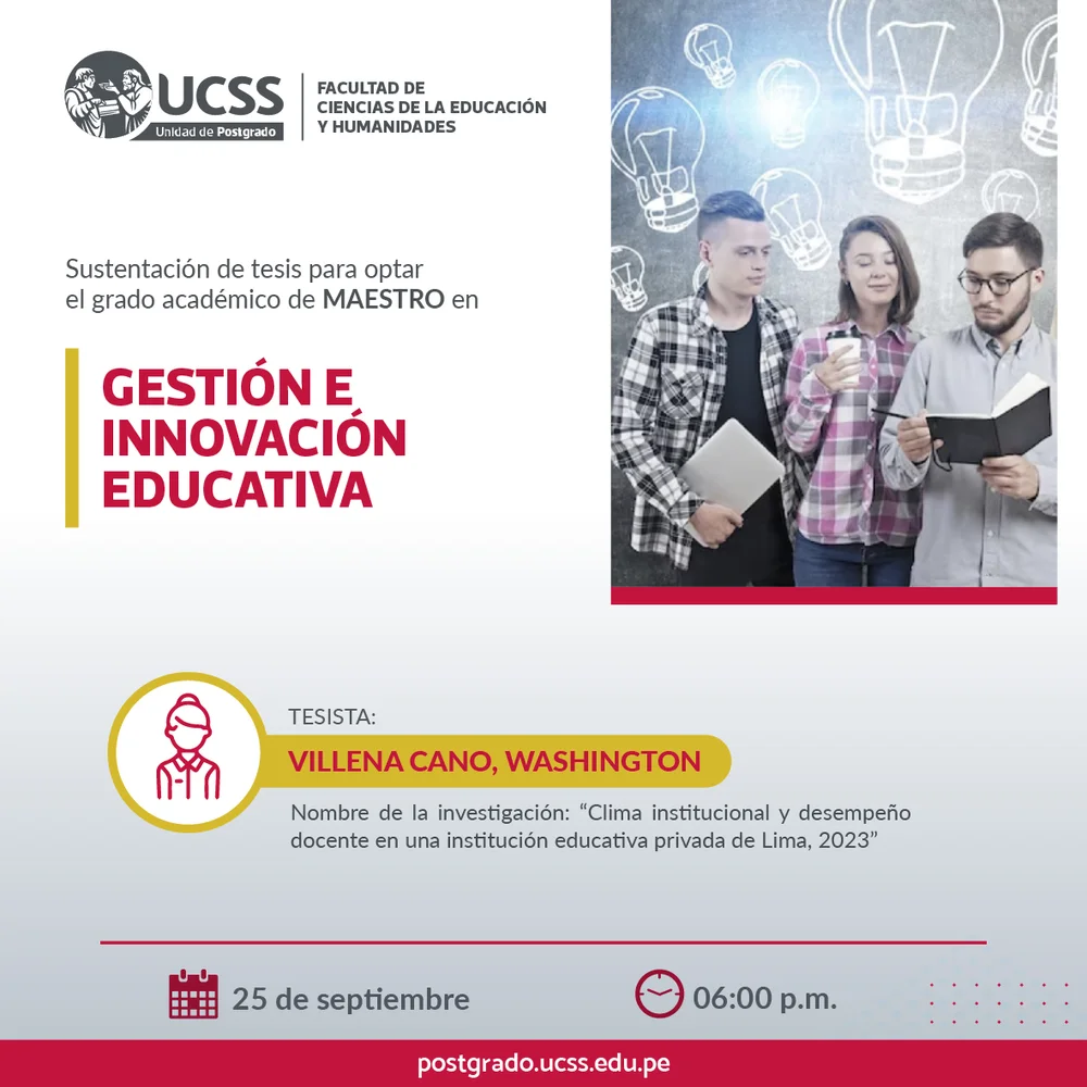 SUSTENTACIÓN DE TESIS PARA OPTAR EL GRADO ACADÉMICO DE MAESTRO EN GESTIÓN E INNOVACIÓN EDUCATIVA ENLACE ZOOM: https://zoom.us/j/98990024916