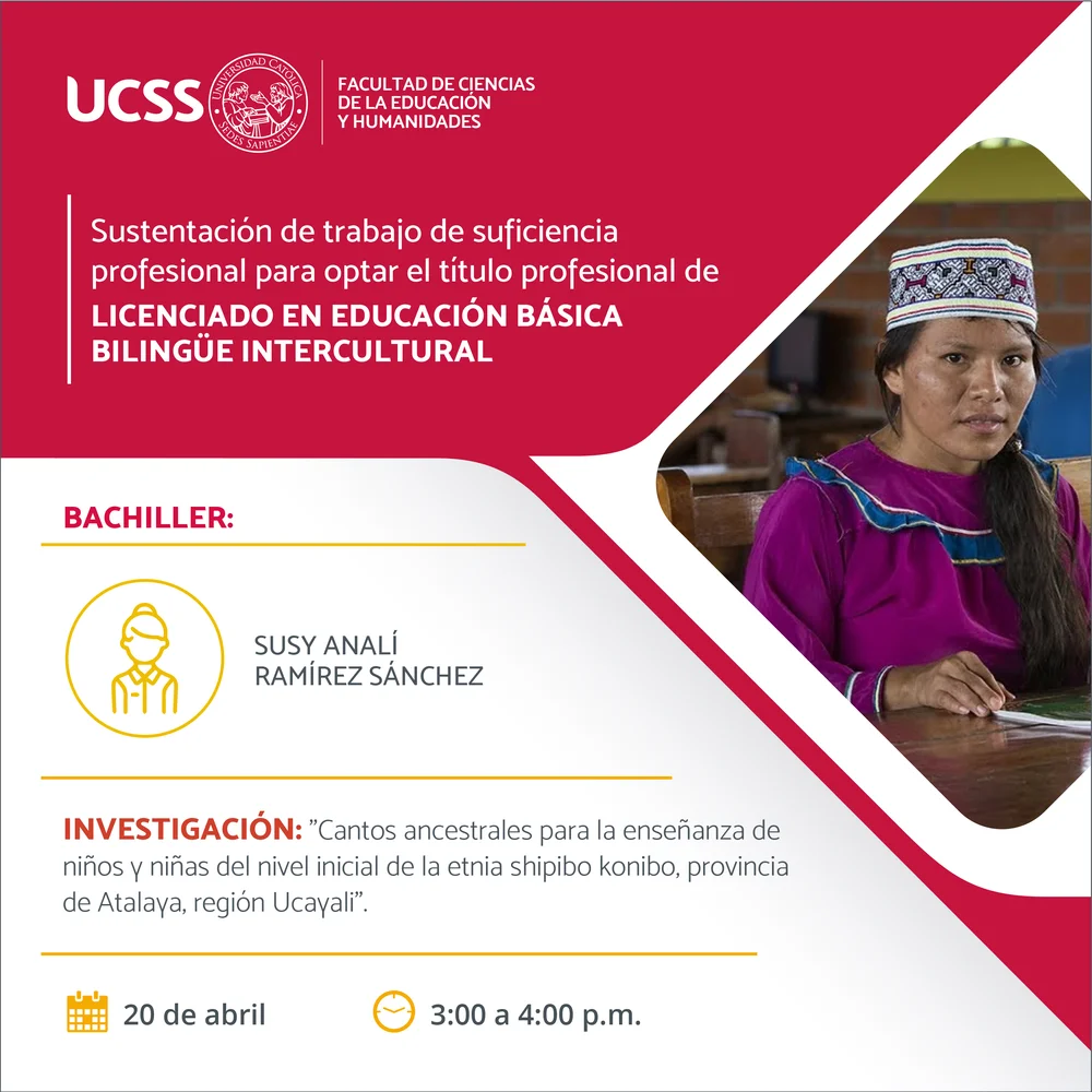SUSTENTACIÓN DE TESIS: CANTOS ANCESTRALES PARA LA ENSEÑANZA DE NIÑOS Y NIÑAS DEL NIVEL INICIAL DE LA ETNIA SHIPIBO KONIBO, PROVINCIA DE ATALAYA, REGIÓN UCAYALI. ENLACE ZOOM: https://zoom.us/j/94558725321 ID de reunión: 945 5872 5321