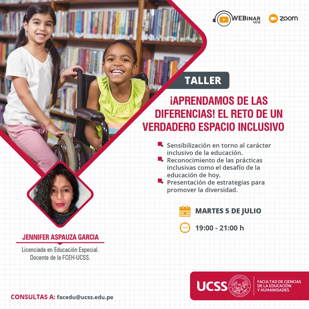 TALLER: ¡APRENDAMOS DE LAS DIFERENCIAS! EL RETO DE UN VERDADERO ESPACIO INCLUSIVO https://zoom.us/j/96202260485?pwd=dDJlTU05ZkRFdUhJTkVtclN5cmUvUT09