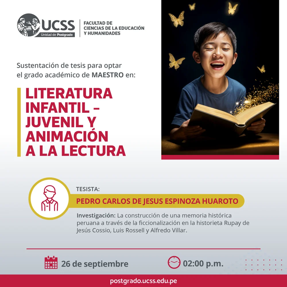 SUSTENTACIÓN DE TESIS PARA OPTAR EL GRADO ACADÉMICO DE MAESTRO EN LITERATURA INFANTIL - JUVENIL Y ANIMACIÓN A LA LECTURA ENLACE ZOOM: https://zoom.us/j/96727225454