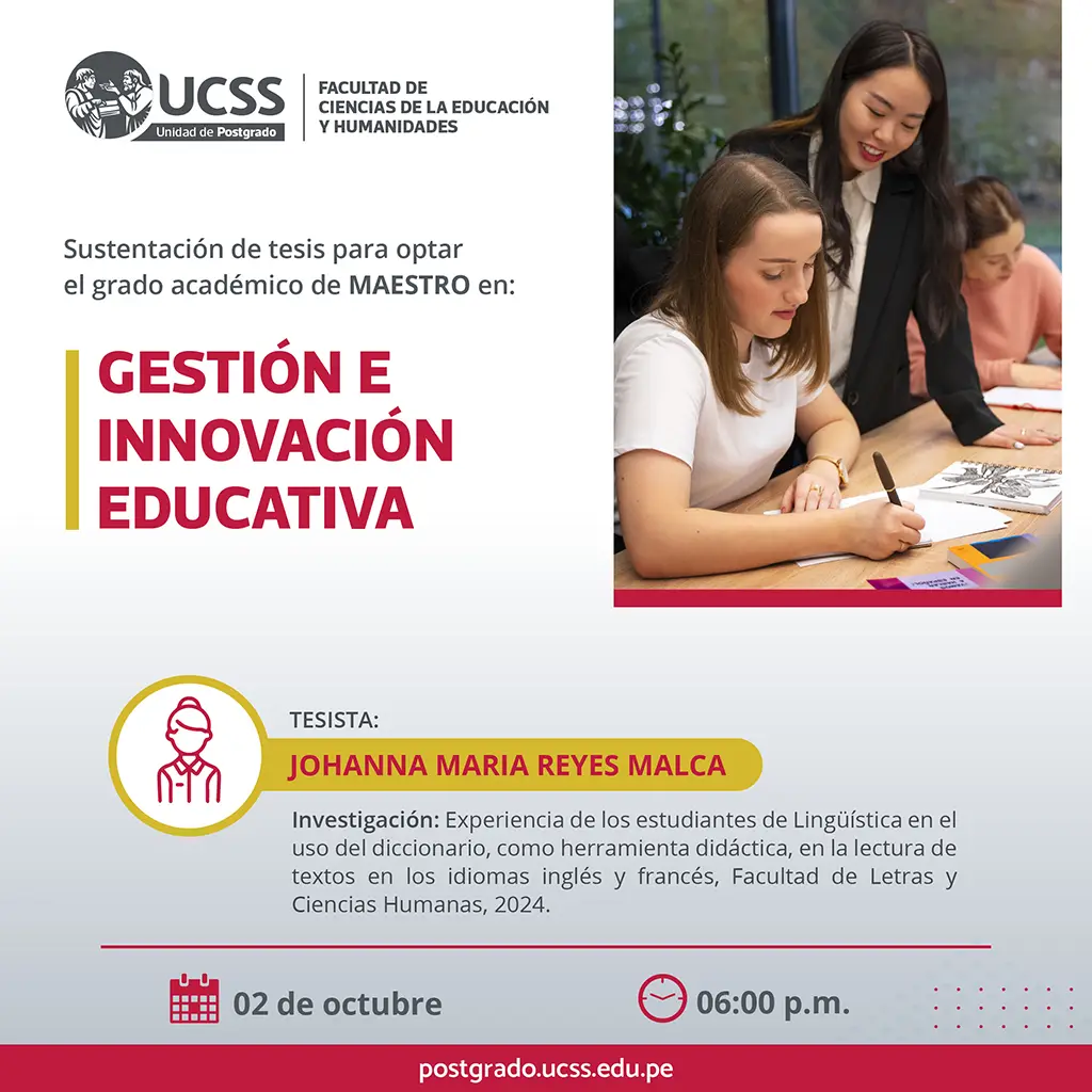 SUSTENTACIÓN DE TESIS PARA OPTAR EL GRADO ACADÉMICO DE MAESTRO EN GESTIÓN E INNOVACIÓN EDUCATIVA ENLACE ZOOM: https://zoom.us/j/94515774018