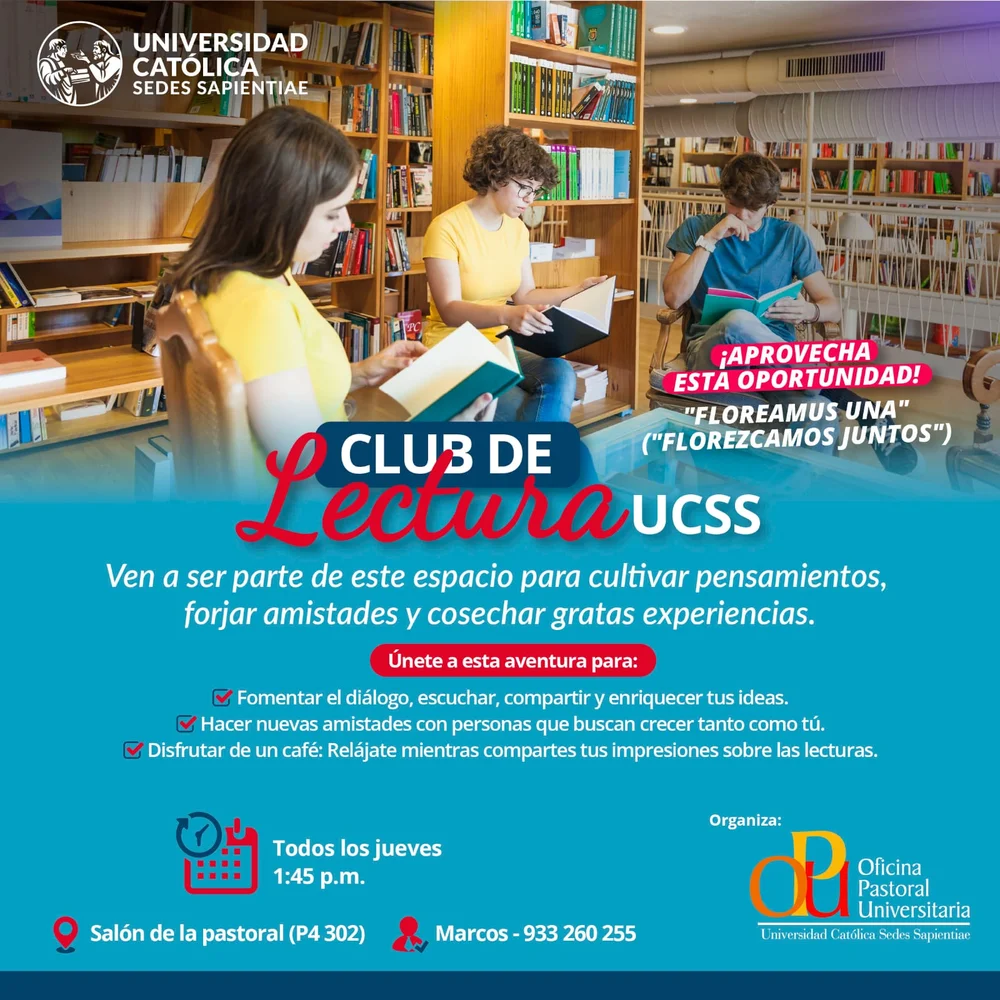 CLUB DE LECTURA UCSS Contacto: Marcos - 933 260 255 - Lugar: Biblioteca UCSS (LC) Leer más: CLUB DE LECTURA UCSS