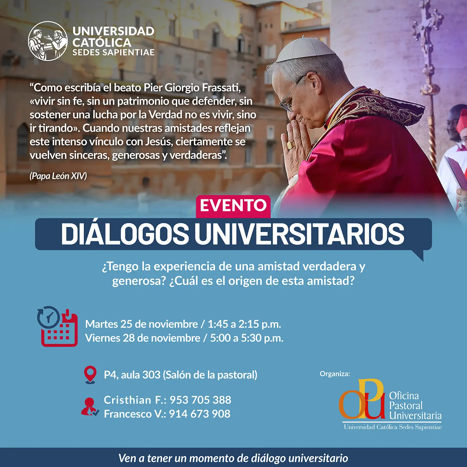 NOVIEMBRE-DICIEMBRE: DIÁLOGOS UNIVERSITARIOS Contactos: CHRISTIAN - 953 705 388 / FRANCESCO - 914 673 908 Leer más: NOVIEMBRE-DICIEMBRE: DIÁLOGOS UNIVERSITARIOS